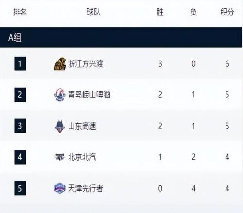 由于A小组只有五支球队,并没有像其他三个小组一样进行分区,而是直接进行了单循环比赛。在目前的积分榜上,广厦男篮以三战全胜的战绩位居小组第一,青岛男篮和山东男篮都是两胜一负,天津男篮提前打完了四场比赛,以全败战绩垫底。